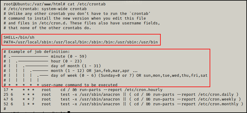 最后,我们需要知道如何读取 cron 任务。幸运的是,/etc/crontab 文件对此做了很好的解释。