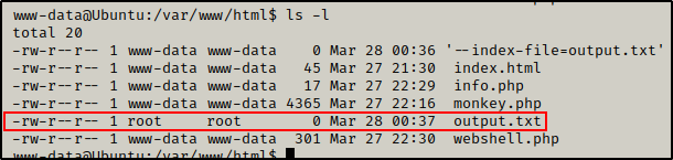通过快速从目录中删除 output.txt,然后运行 PoC,我们可以看到,由于我们不是 root(不能在 /root 中写入),所以出现了错误。不过,我们也可以看到 output.txt 文件已经创建。为了确认是我们创建了这个文件(而不是 cron 作业),我们可以看到这次的所有者不是 root,而是 www-data。