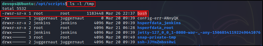 不到一分钟,/tmp 目录中就会出现一个新的 SUID bash 二进制文件!