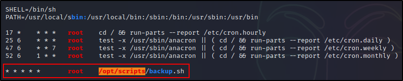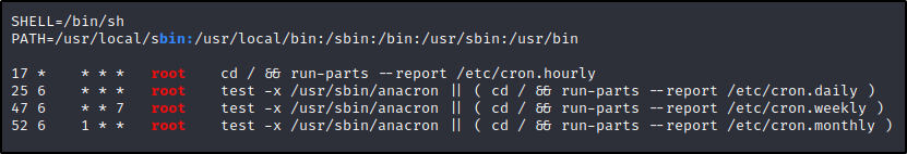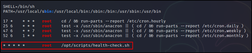 在这里我们可以看到,LinPEAS 列举了我们手动能找到的有关 cron 作业的所有相同信息(crontab + 4 个 cron 目录)。
