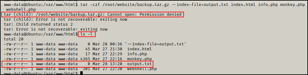 tar -czf /root/website/backup.tar.gz --index-file=output.txt index.html info.php monkey.php webshell.php