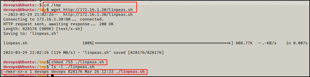 然后在受害机器上,我们可以先移动到 /tmp 目录,再下载 LinPEAS,然后授予其执行权限。