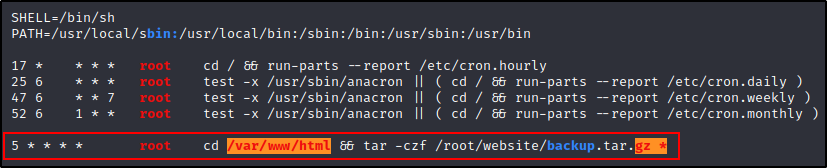 这里我们可以看到一个 cron 任务,以 root 身份每 5 分钟运行一次。我们还可以看到目录和命令都是红色/黄色标识。