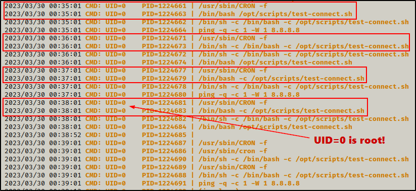 几分钟后,我们不仅可以清楚地看到 cron 作业每分钟都在运行,而且它还以 root 身份运行!