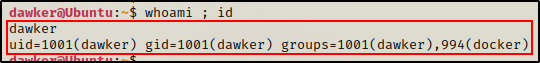在这里可以看到当前用户是一个名为 dawker 的标准用户。然而,在该用户所属的组列表中,我们可以看到一个有趣的发现--当前用户已位于 docker 组中!