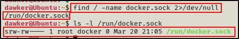 运行 find 命令后,docker.sock 文件的位置就暴露了。找到后,我们可以检查该文件的权限。