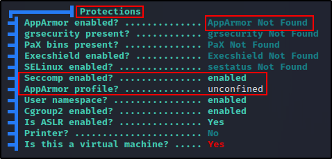 在这里我们可以看到 LinPEAS 已经确定我们处于一个容器中,并且它表明 AppArmor 是 “unconfined”。然而,最有趣的发现是 docker 很容易受到 “release_agent breakout” 1 和 2 的影响。