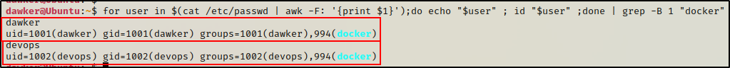for user in $(cat /etc/passwd | awk -F: '{print $1}');do echo "$user" ; id "$user" ;done | grep -B 1 "docker"