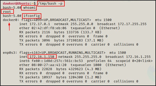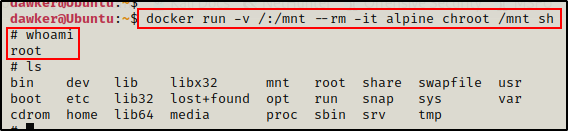 Great!在这里,我们可以看到 docker 守护进程是以 root 的身份运行的,这意味着我们可以以 root 的身份在容器外执行命令