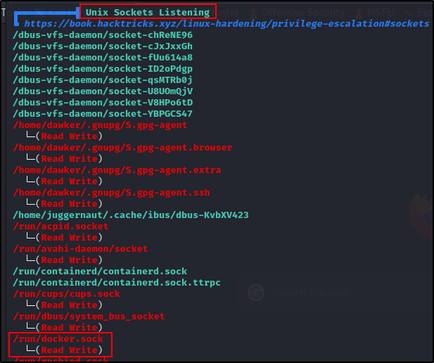 在同一部分中进一步向下滚动。我们将会遇到 Unix Sockets。在这里我们会发现 docker.sock 文件是可写的。