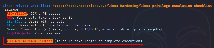 本节以外的其余检查都是标准检查,由于已经是 root,所以它们充满了红色/黄色发现的误报。