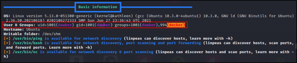 LinPEAS 首先要做的检查之一是 "Basic Information",它基本上是通过几个简单的命令来提供高级信息。