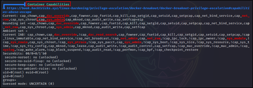 如果容器拥有默认权限,那么它基本就被锁定了。不过,我们仍应检查是否授予了任何权限。如果我们运气好,启用了正确的组合,我们就可以逃出这个容器。
