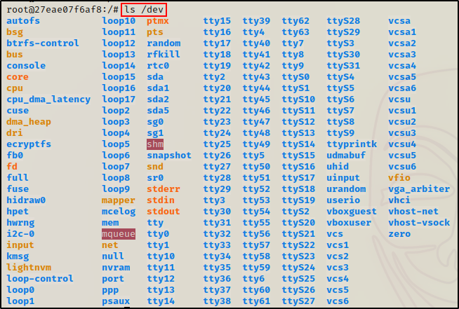 在 /dev 中看到大量文件和子目录,证明这是一个特权容器。在非特权容器中,我们不会在其中看到如此多的文件。