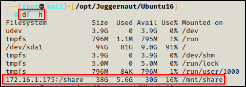 挂载成功,现在使用命令 df -h 查看所有挂载点,可以看到远程 172.16.1.175:/share 已挂载到本地 /mnt/share。