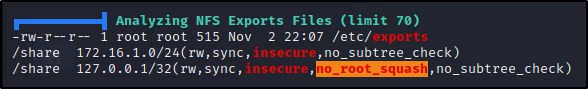 第二个 /share 条目确实启用了 no_root_squash,这意味着在本地访问共享将允许特权文件写入!