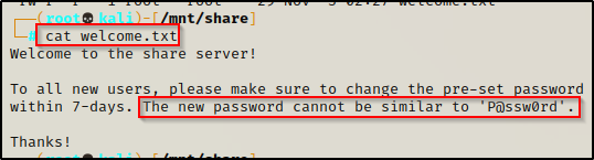 而现在,我们所能做的就是枚举此时共享内的文件,所以让我们看看 “welcome.txt” 有什么。