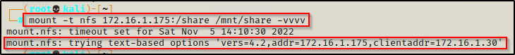 mount -t nfs 172.16.1.175:/share /mnt/share -vvvv