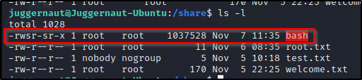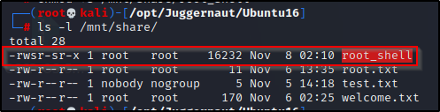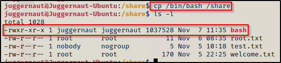 完成后,我们可以检查 /mnt/share 文件夹以确认该二进制文件归 root 所有并设置了 SUID 位。