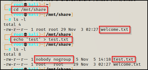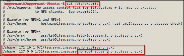 第一个 /share 条目适用于外部 IP 客户端,在 ACL 设置中不包含 no_root_squash。这意味着 root_squash 是隐含的,这就是为什么我们的测试文件被写成 nobody:nogroup 的原因。如果启用了 no_root_squash,文件就会被写为 root。