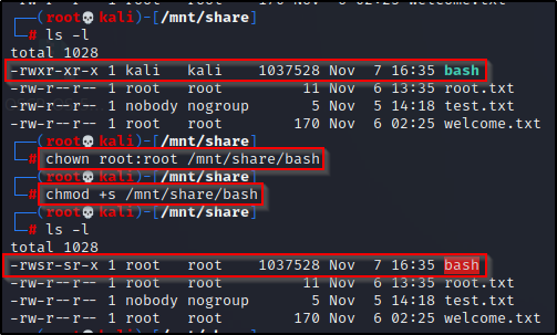有了共享中的 bash 文件,接下来我们需要回到攻击者机器上,将文件的所有权更改为 root 并授予它 SUID 权限。
