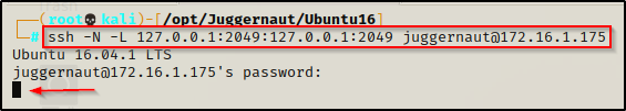 由于我们知道 NFS 共享在端口 2049 上运行,并且还知道 juggernaut 用户可以通过 SSH 访问系统,因此将此端口转发到攻击者计算机的最简单方法是执行本地端口转发。