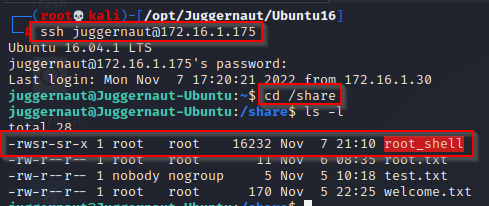 进入 root shell 的一种更简单的方法是将 /bin/bash 复制到我们挂载的共享文件夹中,并将所有权更改为 root:root 并为其授予 SUID 权限。最后,我们只需要通过 SSH 作为 Juggernaut 返回受害者,然后执行 SUID bash 二进制文件以获得 root shell。