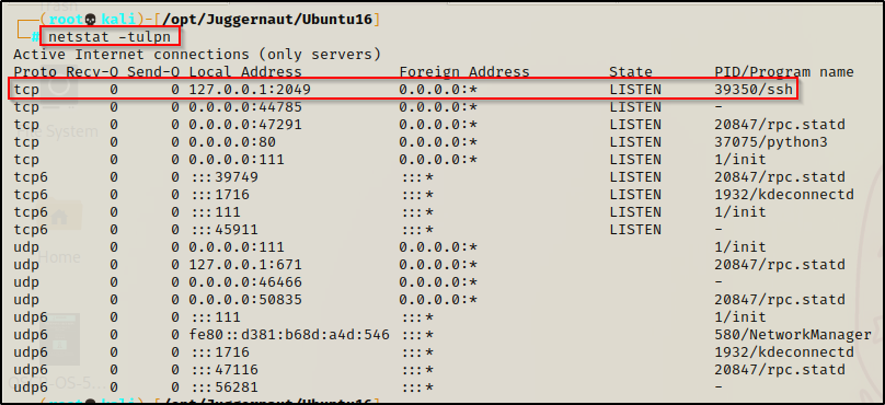 看到提示挂起,说明端口转发成功;当我们在攻击者机器上打开一个新选项卡并运行 netstat -tulpn 命令时,我们应该看到端口 2049 在本地打开。