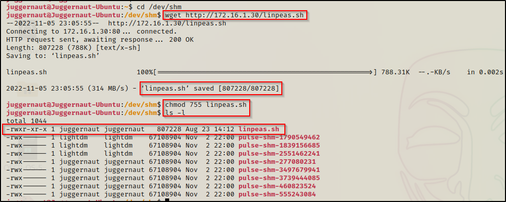 二进制文件的 所有者/组 之所以显示为攻击者机器上的 kali:kali,是因为受害者机器上的用户 juggernaut 的 uid 正好同攻击者机器上的用户 kali 的 uid 相同。