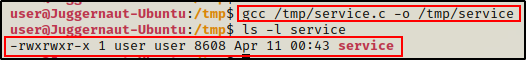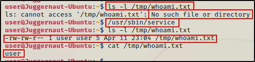 现在,我们所要做的就是运行 service 二进制文件,然后检查 /tmp 文件夹,查看是否创建了一个名为 whoami.txt 的新文件。