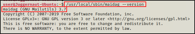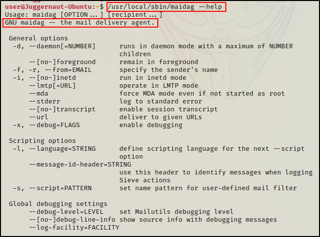 在这里我们可以看到二进制文件确实有一个帮助菜单,这意味着它不是一个简单的“内部”自定义二进制文件。这告诉我们 maidag 是 “GNU maidag – 邮件传递代理”。