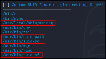 现在我们已经利用了六个标准二进制文件,在本文的第 2 部分,我们将把重点转移到利用四个自定义二进制文件:suid-so、suid-path、suid-sf、maidag。