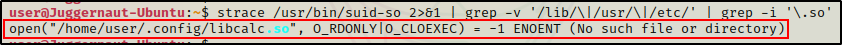 strace /usr/bin/suid-so 2>&1 | grep -v '/lib/\|/usr/\|/etc/' | grep -i '\.so'