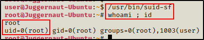 因为 SUID 位是在 suid-sf 二进制文件上发送的,所以它将以 root 身份执行 /usr/bin/service 并运行我们在函数中定义的命令。