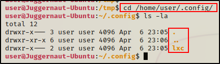 导航到 /home/user/.config ,我们可以看到该目录中没有libcal.so文件。