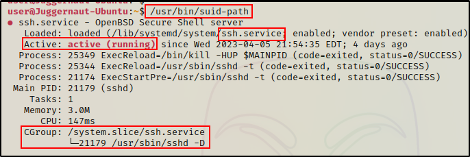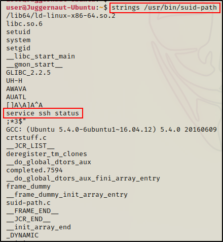 之前运行 suid-path 二进制文件时,我们注意到它会检查 SSH 服务的状态,现在我们知道了输出的来源指令。