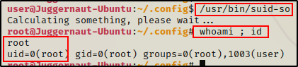 由于 suid-so 二进制文件由 root 拥有并设置了 SUID 位,因此当它执行时,我们的恶意共享对象文件将由程序加载并以 root 身份执行。