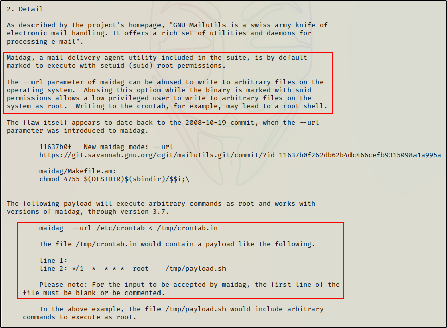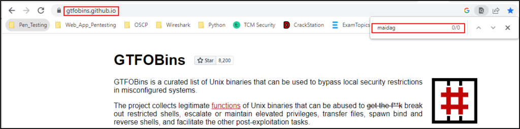 不幸的是,我们没有在 GTFOBins 上找到 maidag 二进制文件。
