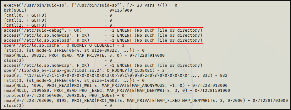 strace /usr/local/bin/suid-so 2>&1 | less