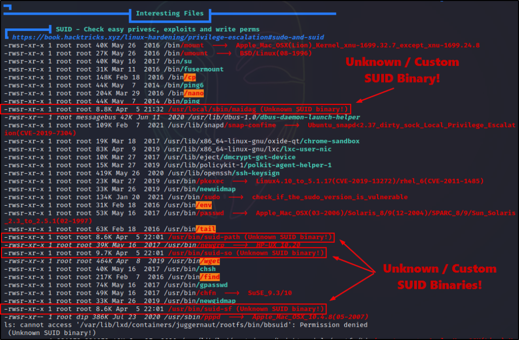 除了使用 LinPEAS 和 SUID3NUM 在受害者主机上发现的 6 个标准二进制文件之外,我们还发现了 4 个看起来很有趣的自定义二进制文件。